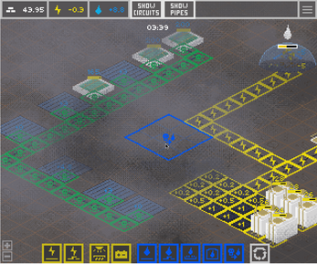 The player can build a couple of buildings on an isometric tiled map and connect them using wires/pipes and switches/valves. The challenge is to provide a stable supply of electricity and water to the dome despite the day/night cycle, rains, storms and earthquakes. The strategy part is designing the base in a way that I can always recover after an outage of any of my systems.